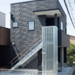 外観はお客様こだわりの黒い外装と金属の階段とし、2階の窓際には緑を配して通りからの印象を和らげました。