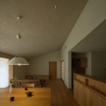 西側には、採光や通風を意識して坪庭を確保しました。屋根は単純な切妻屋根とし、外壁は左官仕上げで少し粗めの仕上げとしました。内部は、出来るだけ天然由来の素材を使うことを心がけ、壁・天井などは、調湿・消臭作用をもつ火山灰を主原料とした左官材を用いました。また殆どの建具は、開け放って使っても建具の存在が気にならぬように引き込み戸としました。